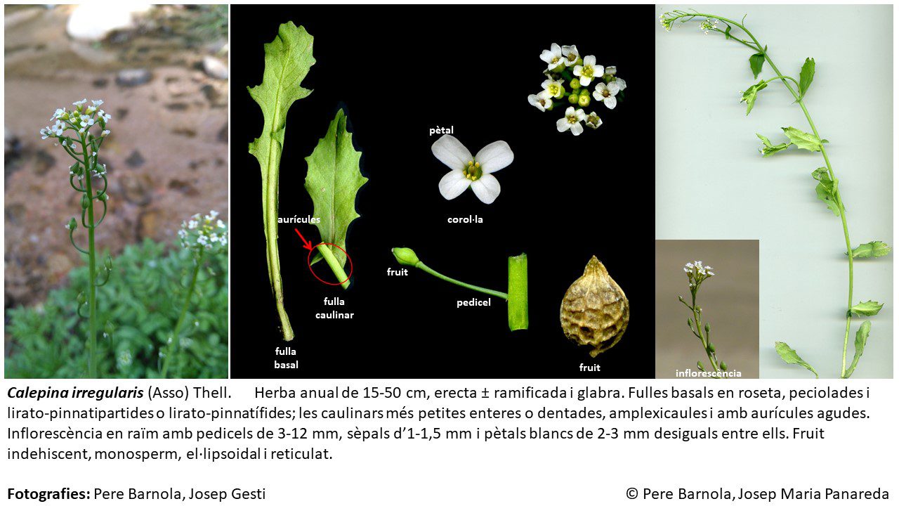 És una herba anual de 15-50 cm, erecta ± ramificada i glabra. Les fulles basals en roseta, peciolades i lirato-pinnatipartides o lirato-pinnatífides; les caulinars més petites enteres odentades, amplexicaules i amb aurícules agudes. La iInflorescència és en raïm amb pedicels de 3-12 mm, sèpals d’1-1,5 mm i pètals blancs de 2-3 mm desiguals entre ells. El fruit és indehiscent, monosperm, el·lipsoidal i reticulat.