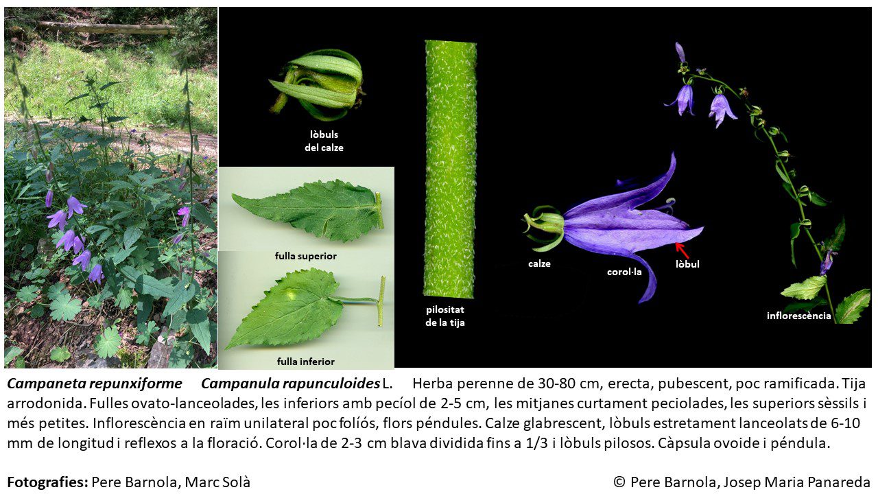 És una herba perenne de 30-80 cm, erecta, pubescent, poc ramificada i amb la tija arrodonida. Les fulles són ovato-lanceolades, les inferiors amb pecíol de 2-5 cm, les mitjanes curtament peciolades, les superiors sèssils i més petites. La inflorescència és en raïm unilateral poc folíós i amb les flors péndules. El calze és glabrescent amb els lòbuls estretament lanceolats de 6-10 mm de longitud i reflexos a la floració. La corol·la és de 2-3 cm blava dividida fins a 1/3 i amb els lòbuls pilosos. El fruit és en càpsula ovoide i péndula.