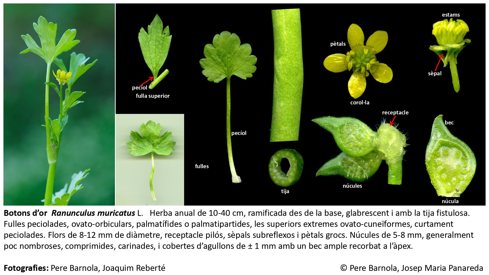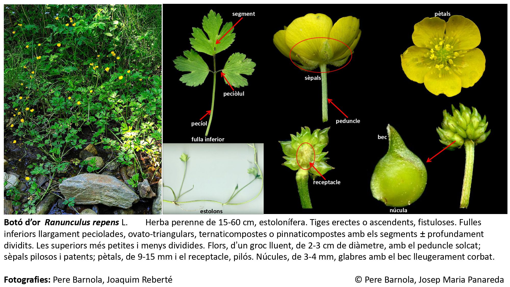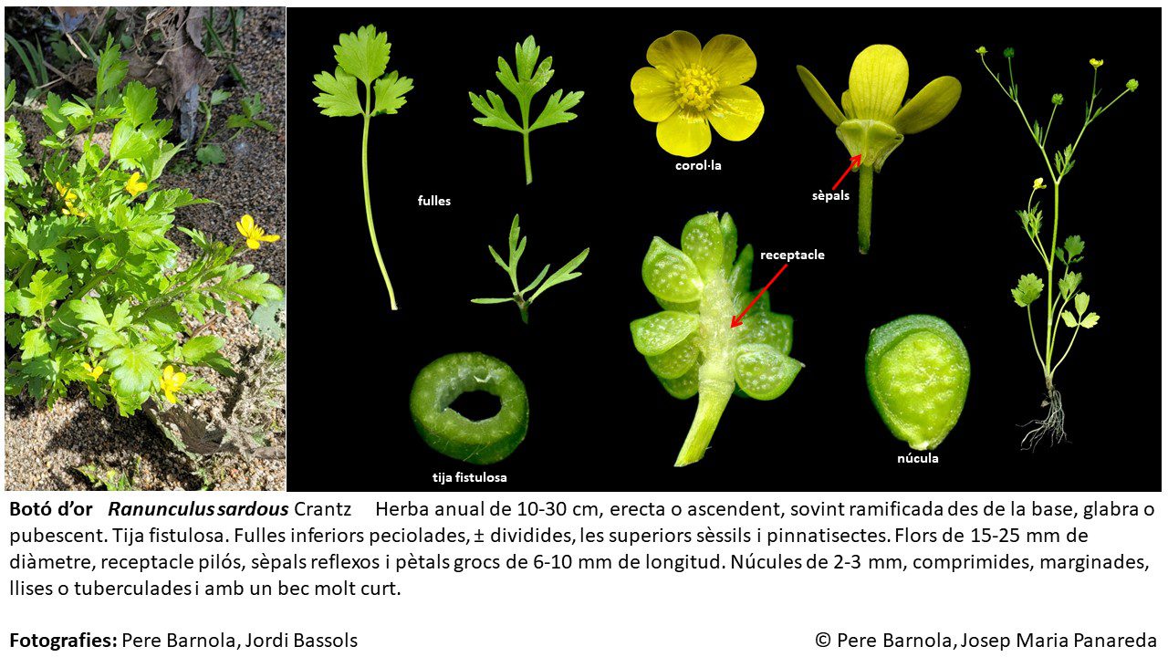 És una herba perenne de 30-100 cm, robusta, glabrescent o pubescent i amb el rizoma ± horitzontal. Les fulles basals són palmatipartides, pentagonals, peciolades i amb 3-7 segments cuneïformes ± profundament dividits; les superiors són sèssils, trisectes i amb els segments subenters. Les flors són grogues, de 15-25 de diàmetre, amb els sèpals pubescents ± patents i els pètals de 8-13 mm; el receptacle és glabre. Els fruits, les núcules, de 2-3,5 mm, són obovades i amb el bec ± corbat.