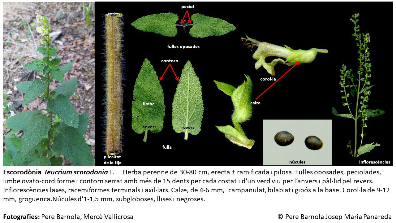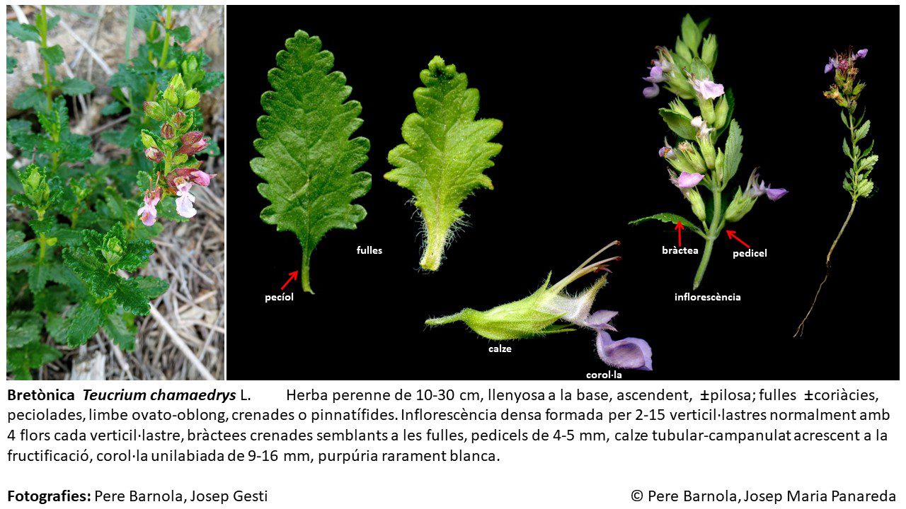 És una mata grisenca de 10-20 cm, erecta o ascendent, amb toment fi sovint aplicat. Les fulles són oposades, oblongues ± crenades o ondulades i d’àpex obtús. La inflorescència formada per glomèruls ordinàriament de més d’1-1,2 cm de diàmetre i amb bràctees de mida semblant o més llargues que les flors. El calze és de 5-7 mm de longitud, amb les dents triangulars de tendència aguda i la corol·la unilabiada de 7-9 mm, blanca o color de crema.