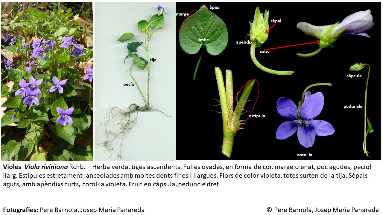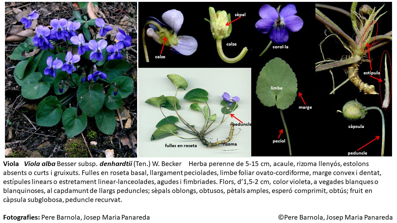 És una herba perenne de 5-15 cm, acaule, amb rizoma llenyós i estolons absents o curts i gruixuts. Té totes les fulles en roseta basal, llargament peciolades i amb el limbe foliar ovato-cordiforme amb el marge convex i dentat, i les estípules linears o estretament linear-lanceolades, agudes i fimbriades. Les flors, d’1,5-2 cm i de color violeta, a vegades blanques o blanquinoses,es troben al capdamunt de llargs peduncles; els sèpals són oblongs i obtusos, els pètals amples i l’esperó comprimit i obtús; el fruit és en càpsula subglobosa i amb el peduncle recurvat.